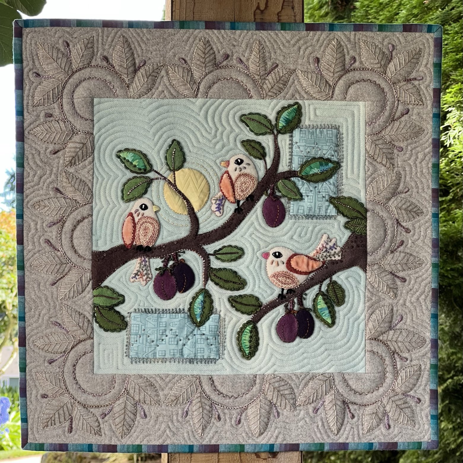Class One: Sewing the background, making and cutting the pattern pieces, wool appliqué, silk velvet appliqué, cotton appliqué, and making cotton/silk circles with Karen Kay Buckley’s Perfect Big Circles. We will also learn how to sew the border.
