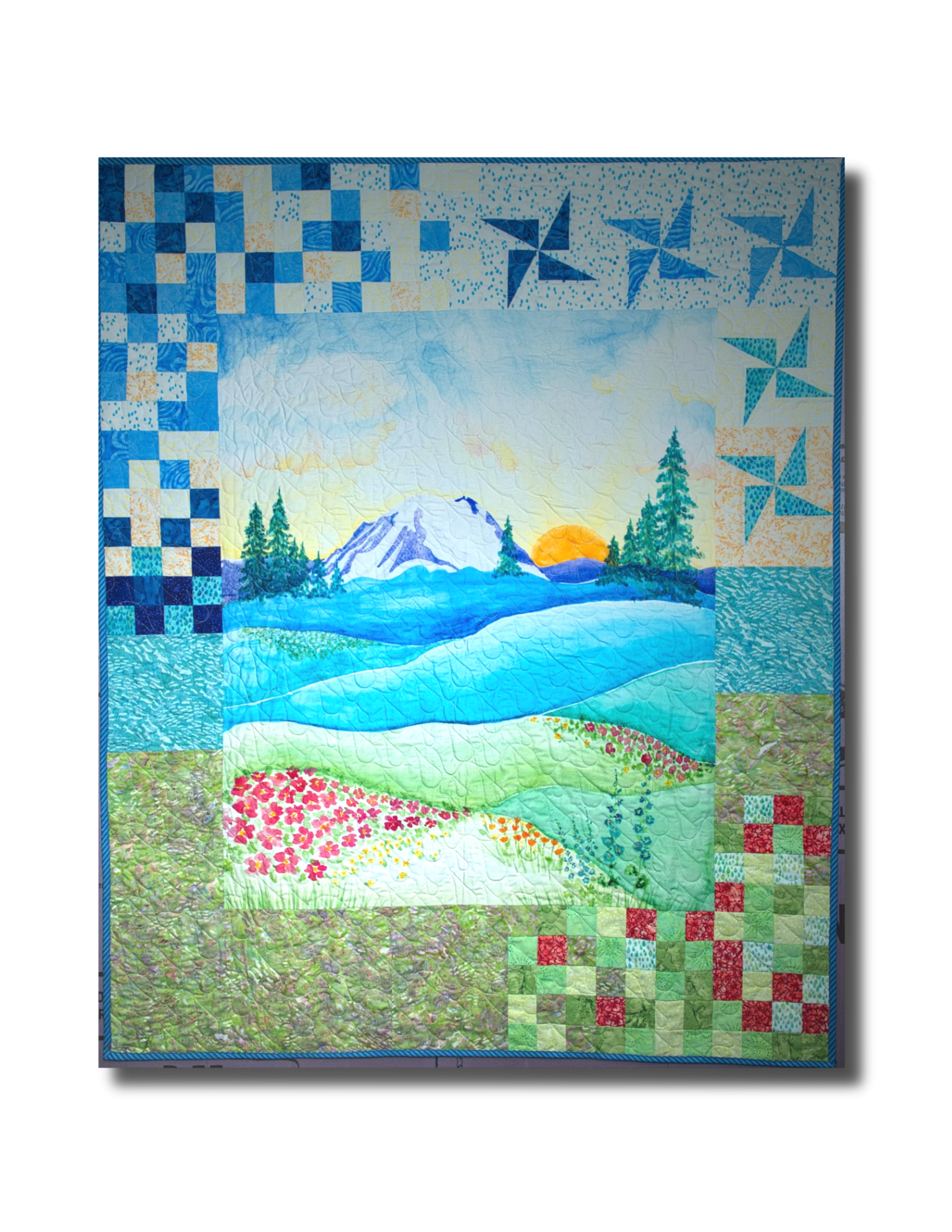 Bring the beauty of nature to your sewing room with the Mountains to Meadows Quilt Kit, a breathtaking landscape quilt featuring majestic mountains, rolling hills, wildflower meadows, and peaceful skies. This artistic quilt captures the feeling of standing at the edge of wilderness—where mountain peaks meet open fields in a serene, colorful panorama.
